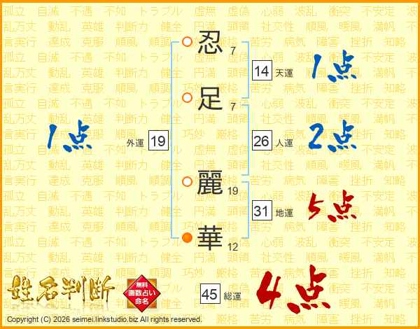 忍(7画)足(7画) 麗(19画)華(12画)