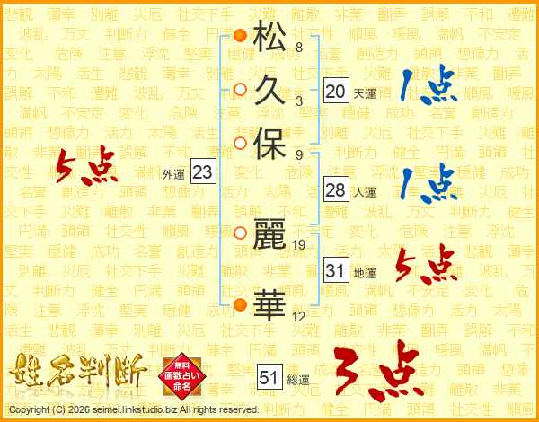 松(8画)久(3画)保(9画) 麗(19画)華(12画)
