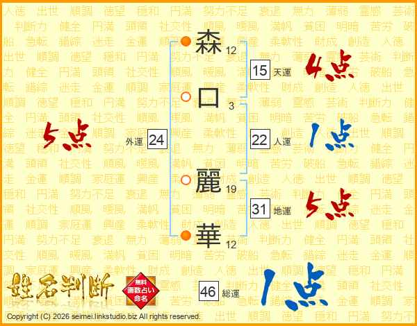 生活面を象徴する運勢です。外部から受ける影響力を表し、結婚運、家庭運や職場、環境への順応性を表します。総運から人運を引いた画数。姓や名が1文字の場合を除く。