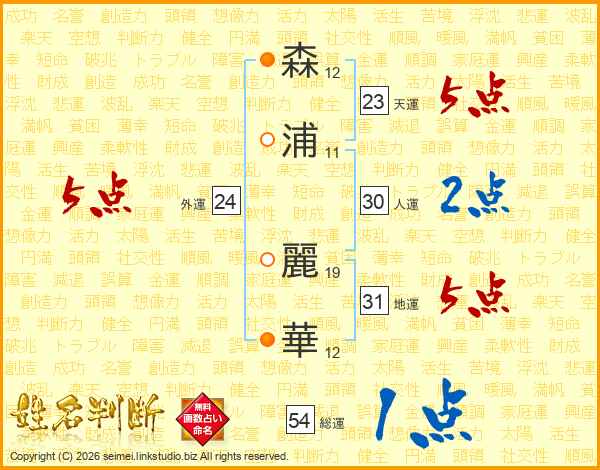 生活面を象徴する運勢です。外部から受ける影響力を表し、結婚運、家庭運や職場、環境への順応性を表します。総運から人運を引いた画数。姓や名が1文字の場合を除く。