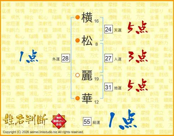 生活面を象徴する運勢です。外部から受ける影響力を表し、結婚運、家庭運や職場、環境への順応性を表します。総運から人運を引いた画数。姓や名が1文字の場合を除く。