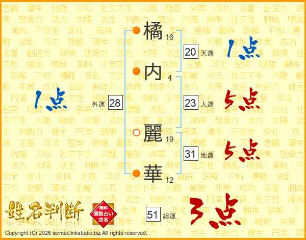 橘(16画)内(4画) 麗(19画)華(12画)