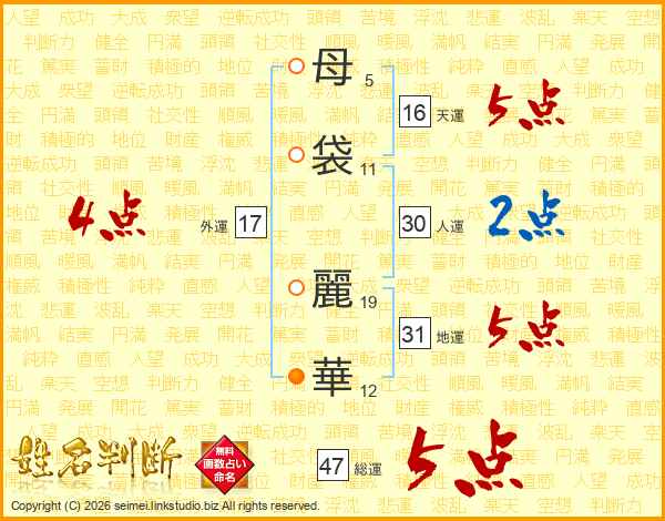 生活面を象徴する運勢です。外部から受ける影響力を表し、結婚運、家庭運や職場、環境への順応性を表します。総運から人運を引いた画数。姓や名が1文字の場合を除く。