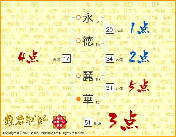 生活面を象徴する運勢です。外部から受ける影響力を表し、結婚運、家庭運や職場、環境への順応性を表します。総運から人運を引いた画数。姓や名が1文字の場合を除く。