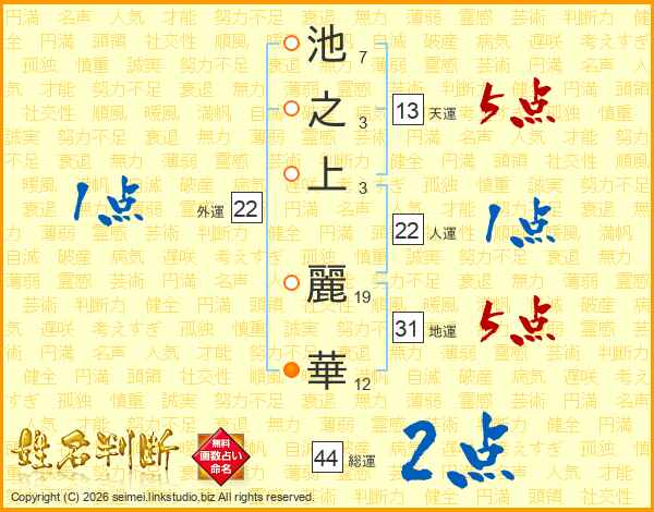 池(7画)之(3画)上(3画) 麗(19画)華(12画)