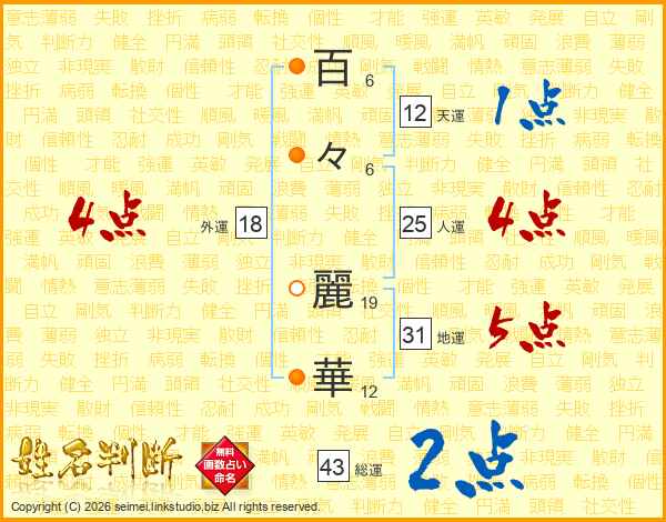 生活面を象徴する運勢です。外部から受ける影響力を表し、結婚運、家庭運や職場、環境への順応性を表します。総運から人運を引いた画数。姓や名が1文字の場合を除く。