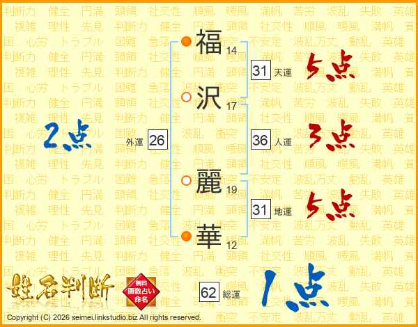 生活面を象徴する運勢です。外部から受ける影響力を表し、結婚運、家庭運や職場、環境への順応性を表します。総運から人運を引いた画数。姓や名が1文字の場合を除く。