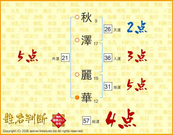 秋(9画)澤(17画) 麗(19画)華(12画)