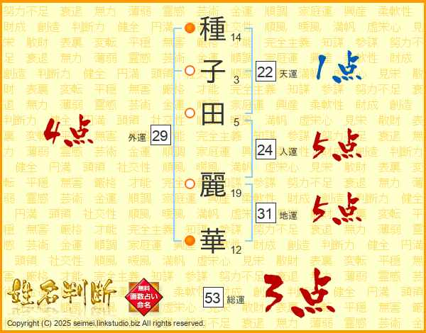 種(14画)子(3画)田(5画) 麗(19画)華(12画)