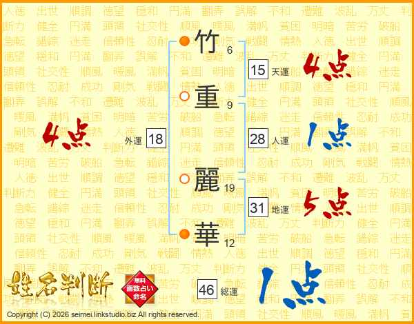 竹重麗華さんの総運は46画の1点!