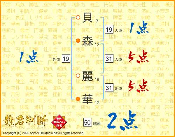 生活面を象徴する運勢です。外部から受ける影響力を表し、結婚運、家庭運や職場、環境への順応性を表します。総運から人運を引いた画数。姓や名が1文字の場合を除く。