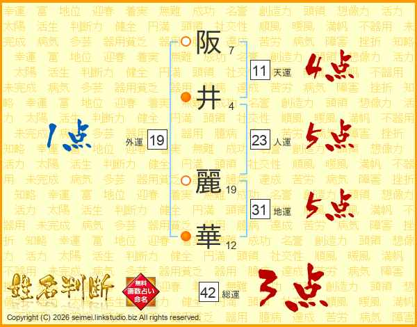 生活面を象徴する運勢です。外部から受ける影響力を表し、結婚運、家庭運や職場、環境への順応性を表します。総運から人運を引いた画数。姓や名が1文字の場合を除く。