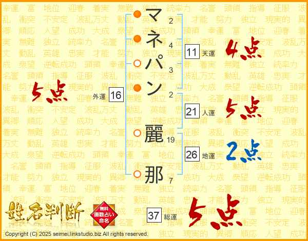 マ(2画)ネ(4画)パ(3画)ン(2画) 麗(19画)那(7画)