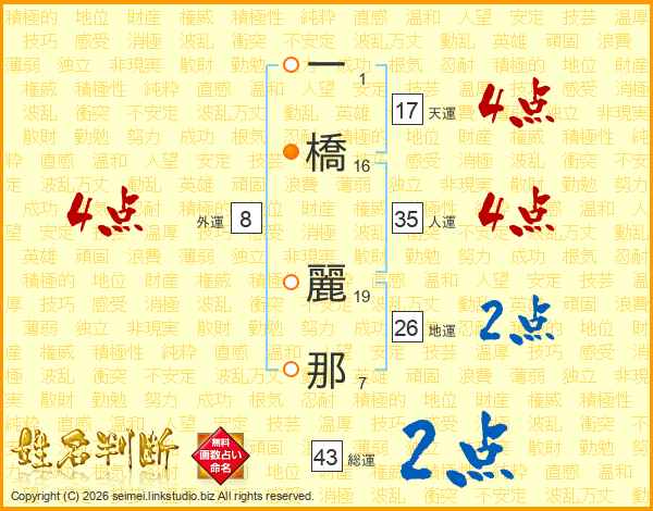 あなたの人生を表す1番重要な運勢です。生涯を通じて影響する総合運となり、主に50歳以降の晩年期に影響を及ぼします。苗字と名前の合計画数。