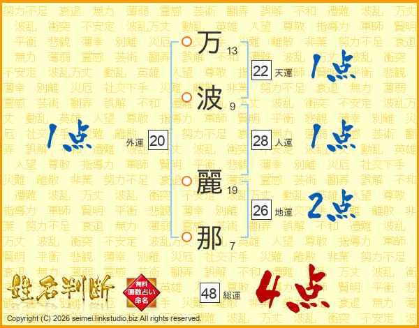 万(13画)波(9画) 麗(19画)那(7画)