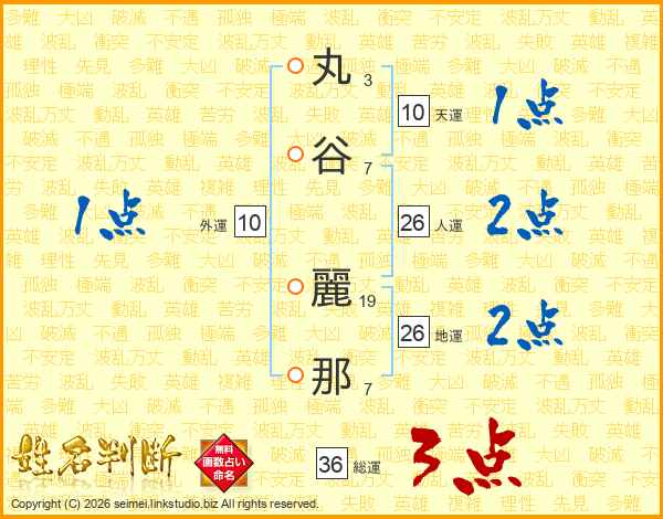 丸(3画)谷(7画) 麗(19画)那(7画)