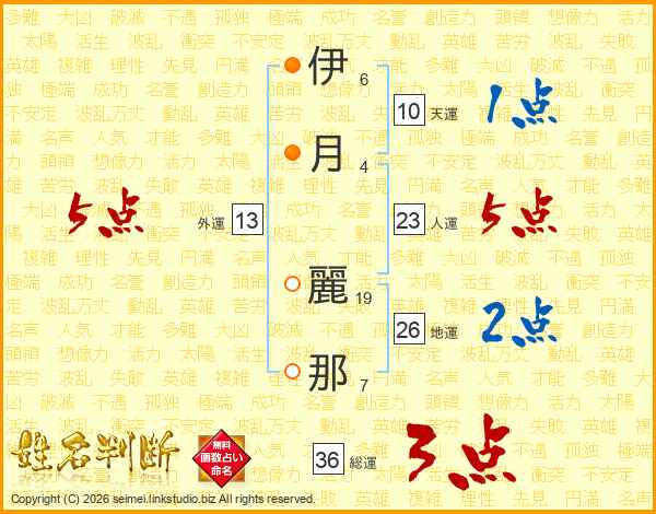 伊(6画)月(4画) 麗(19画)那(7画)