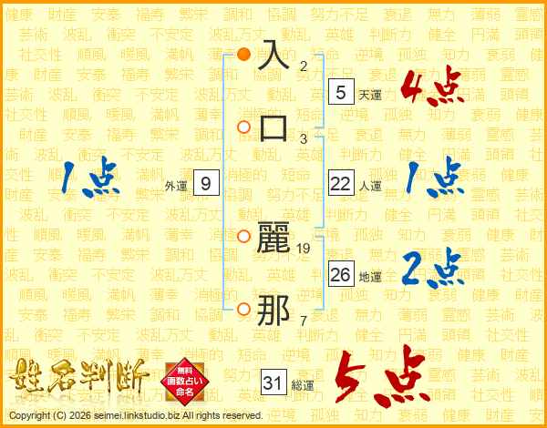 生活面を象徴する運勢です。外部から受ける影響力を表し、結婚運、家庭運や職場、環境への順応性を表します。総運から人運を引いた画数。姓や名が1文字の場合を除く。