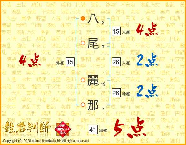八(8画)尾(7画) 麗(19画)那(7画)