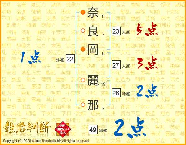 奈(8画)良(7画)岡(8画) 麗(19画)那(7画)
