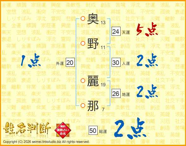 生活面を象徴する運勢です。外部から受ける影響力を表し、結婚運、家庭運や職場、環境への順応性を表します。総運から人運を引いた画数。姓や名が1文字の場合を除く。