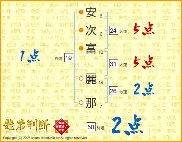安(6画)次(6画)富(12画) 麗(19画)那(7画)