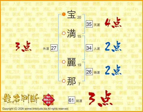 宝(20画)満(15画) 麗(19画)那(7画)