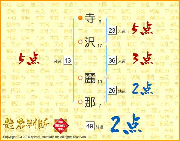 寺沢麗那さんの天運は23画の5点!