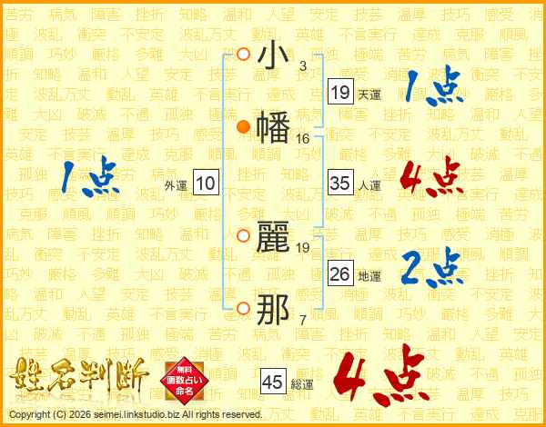 小(3画)幡(16画) 麗(19画)那(7画)