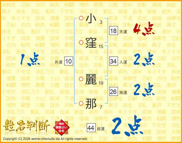 生活面を象徴する運勢です。外部から受ける影響力を表し、結婚運、家庭運や職場、環境への順応性を表します。総運から人運を引いた画数。姓や名が1文字の場合を除く。