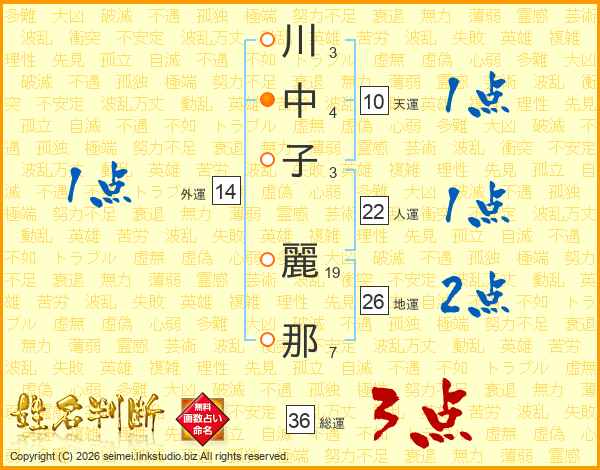 川(3画)中(4画)子(3画) 麗(19画)那(7画)