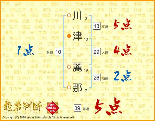川津麗那さんの総運は39画の5点!