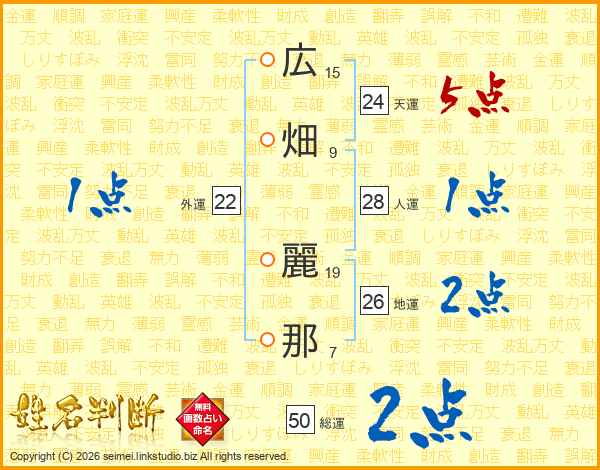 広(15画)畑(9画) 麗(19画)那(7画)