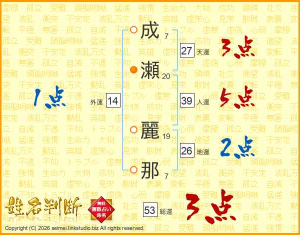 成(7画)瀬(20画) 麗(19画)那(7画)