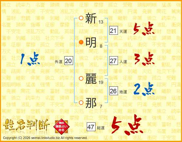 新(13画)明(8画) 麗(19画)那(7画)