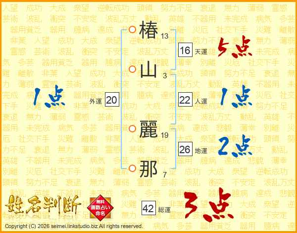 椿(13画)山(3画) 麗(19画)那(7画)