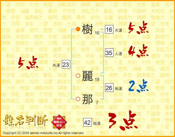 樹(16画) 麗(19画)那(7画)