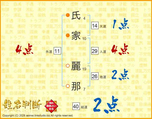 生活面を象徴する運勢です。外部から受ける影響力を表し、結婚運、家庭運や職場、環境への順応性を表します。総運から人運を引いた画数。姓や名が1文字の場合を除く。