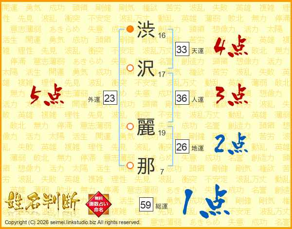 渋(16画)沢(17画) 麗(19画)那(7画)