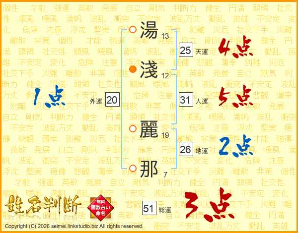 湯(13画)淺(12画) 麗(19画)那(7画)