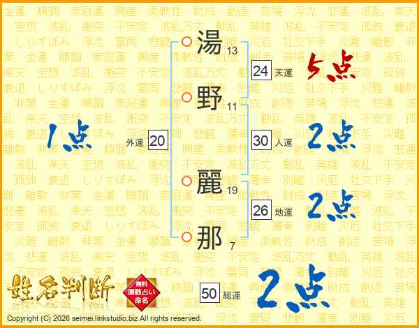 湯(13画)野(11画) 麗(19画)那(7画)