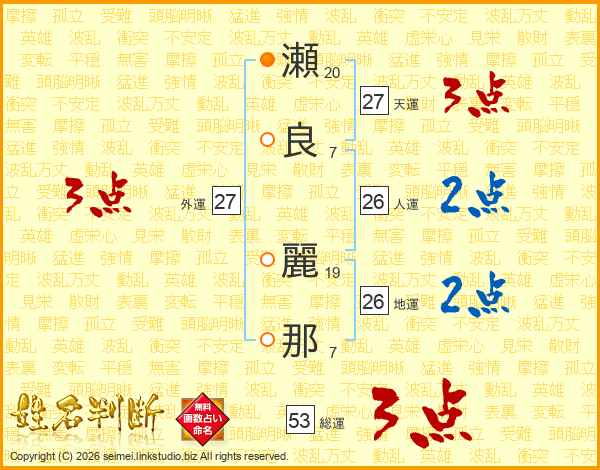 瀬(20画)良(7画) 麗(19画)那(7画)