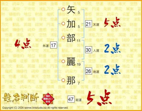 矢(5画)加(5画)部(11画) 麗(19画)那(7画)