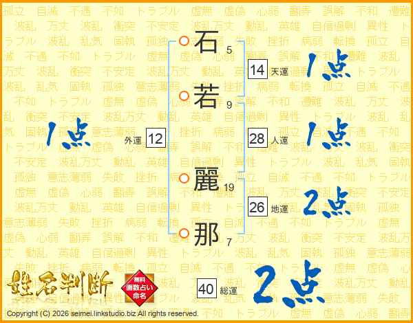 生活面を象徴する運勢です。外部から受ける影響力を表し、結婚運、家庭運や職場、環境への順応性を表します。総運から人運を引いた画数。姓や名が1文字の場合を除く。