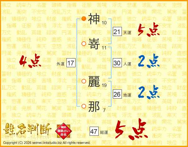 神嵜麗那さんの総運は47画の5点!