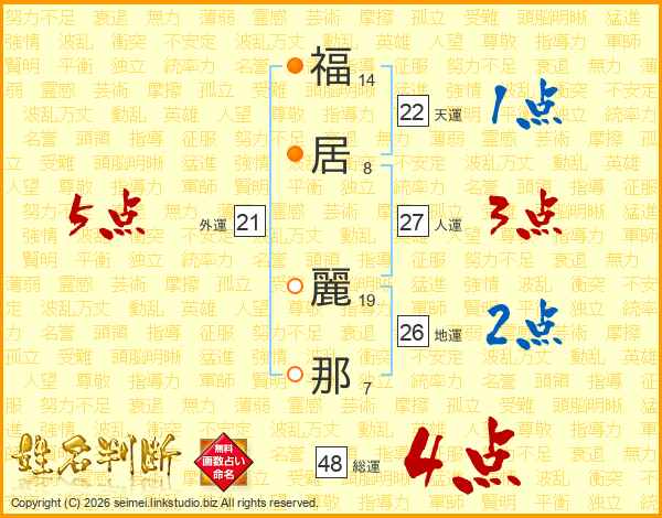 福(14画)居(8画) 麗(19画)那(7画)