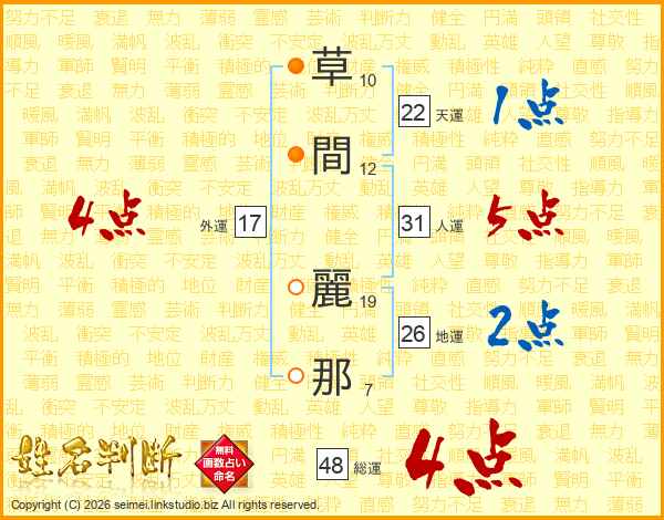 草(10画)間(12画) 麗(19画)那(7画)