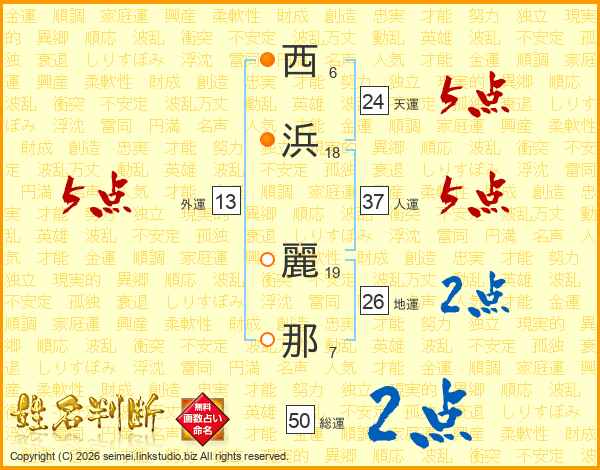 西(6画)浜(18画) 麗(19画)那(7画)