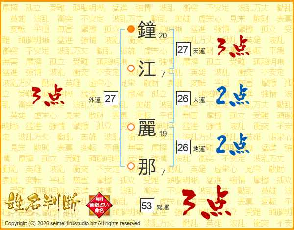 鐘(20画)江(7画) 麗(19画)那(7画)