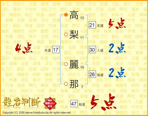高(10画)梨(11画) 麗(19画)那(7画)